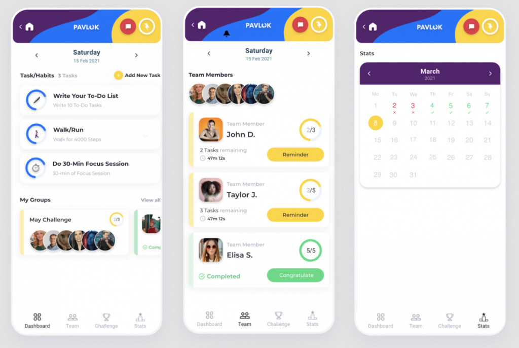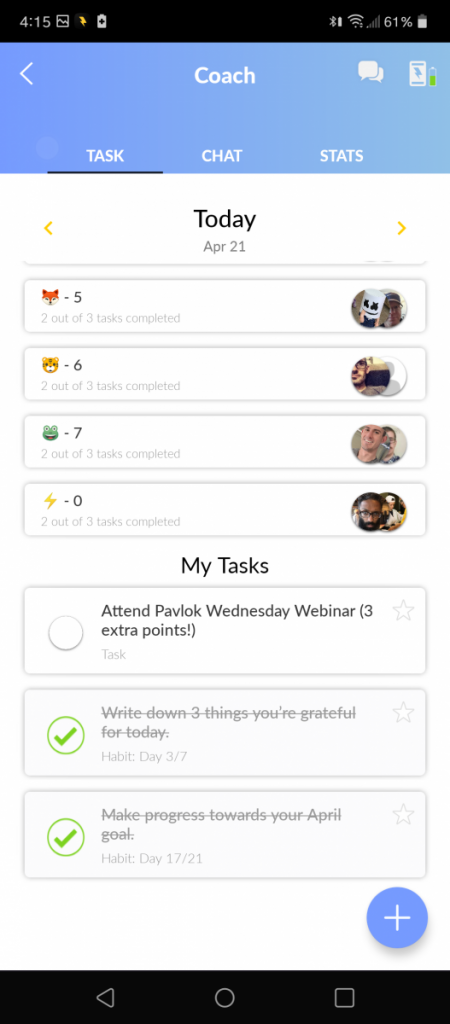 Much of the interaction takes place in a participant-only Facebook group, as well as on Facebook Messenger (though we are working on moving communication to the Pavlok app). Points are awarded based on the reported completion of daily habits that move you closer to your personal goals. The points you receive also help your team, as there are prizes for the team with the best overall score in the challenge.