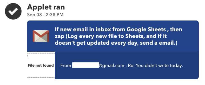 You have a script that checks the last row of the sheet and looks at the day. If that date isn’t today’s date, it means you didn’t write today. In that case, it sends an email.