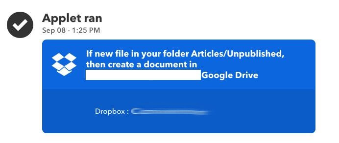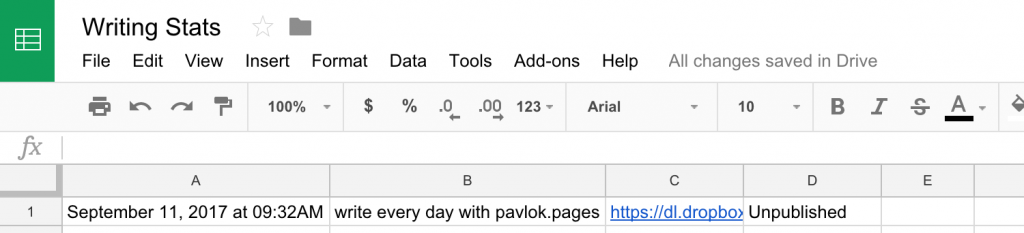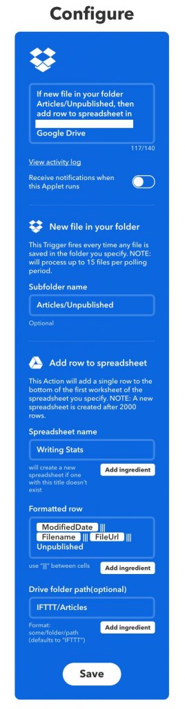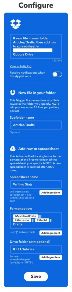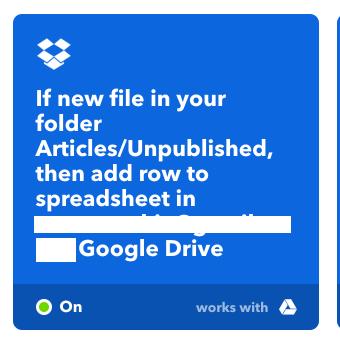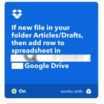 Since I put my articles into Dropbox, I can use IFTTT to write a row to a spreadsheet on Google Sheets. It’s essentially a log book that updates every time a new file is created in one of my writing folders.