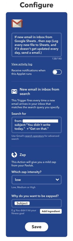 The last step is to get back into IFTTT with a script that checks for that “You didn’t write today…” email and use it as a trigger for Pavlok to zap.