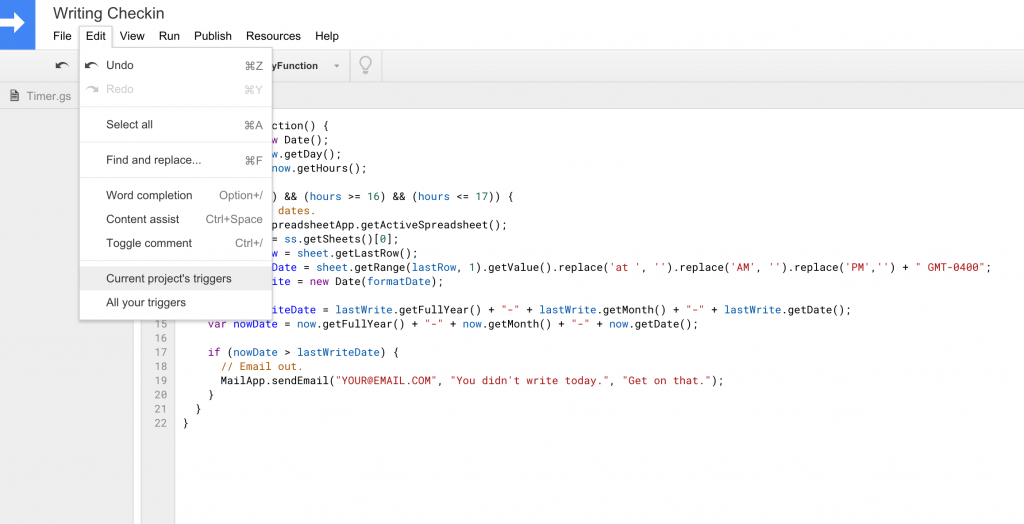 MailApp.sendEmail(“YOUR@EMAIL.COM”, “You didn’t write today.”, “Get on that.”);