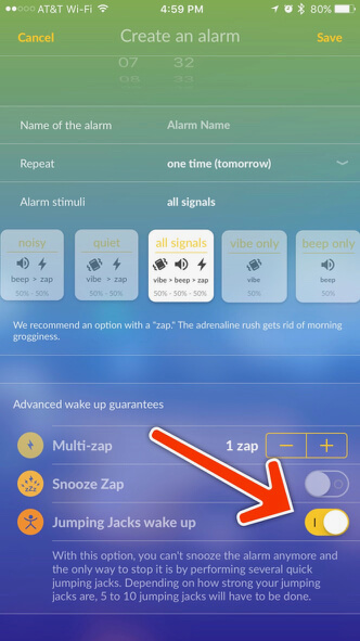 When setting up your alarms, you can also choose the stimuli patterns and even program your Pavlok to require you to get up and do 5 jumping jacks (some refer to these as “Star Jumps”). See the screenshots to locate the proper controls!
