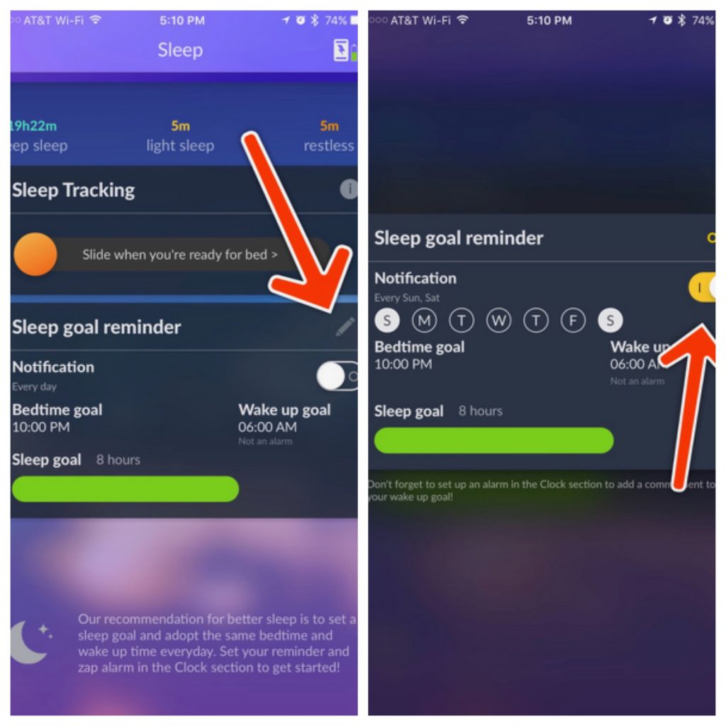 You can set a “Sleep Goal Reminder” on the Sleep page by clicking on the edit pencil icon as shown below: There you can turn on notifications and set up the times to be notified. Tap the wake up goal to set your desired wake up time to properly calculate the sleep goal.