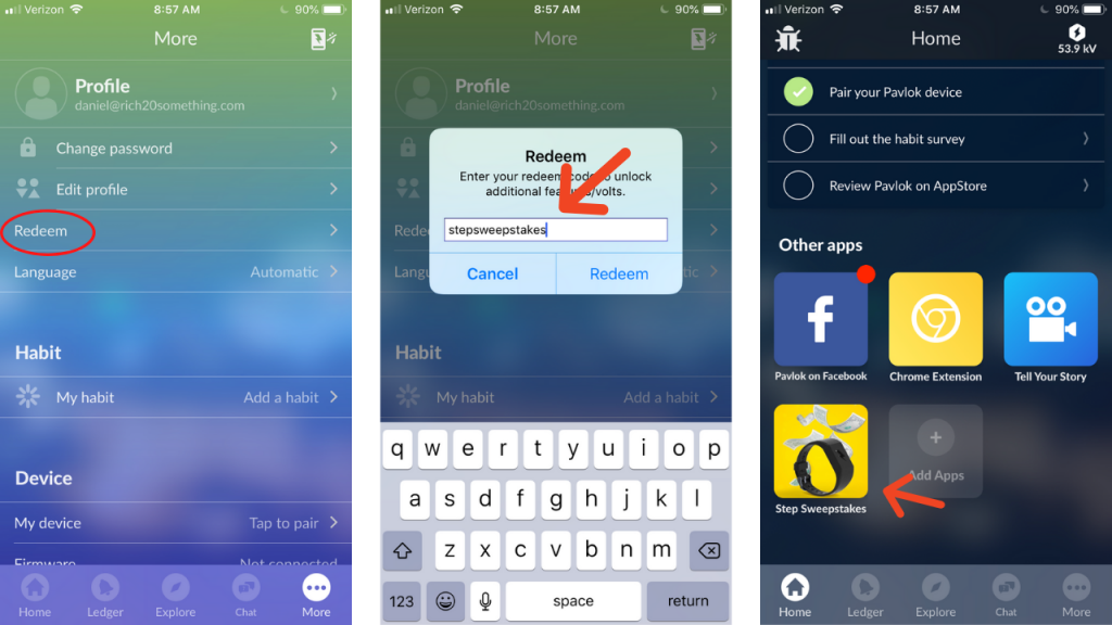 Inside of the app, go to More >> Redeem and type stepsweepstakes and you’re registered. You’ll see a new Pavlok Sweepstakes module on your Home screen in the app.